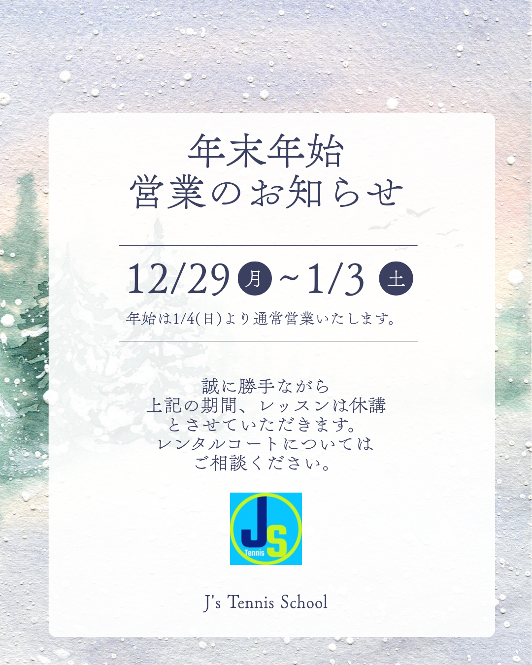 2025年12月29日~2025年1月3日の期間は全レッスンは休講となります。 会員限定無料のフリーコートもありません。 レンタルコートのご利用については、ご相談ください。 また、レンタルコートの料金は土日祝料金となりますので、ご了承ください。...